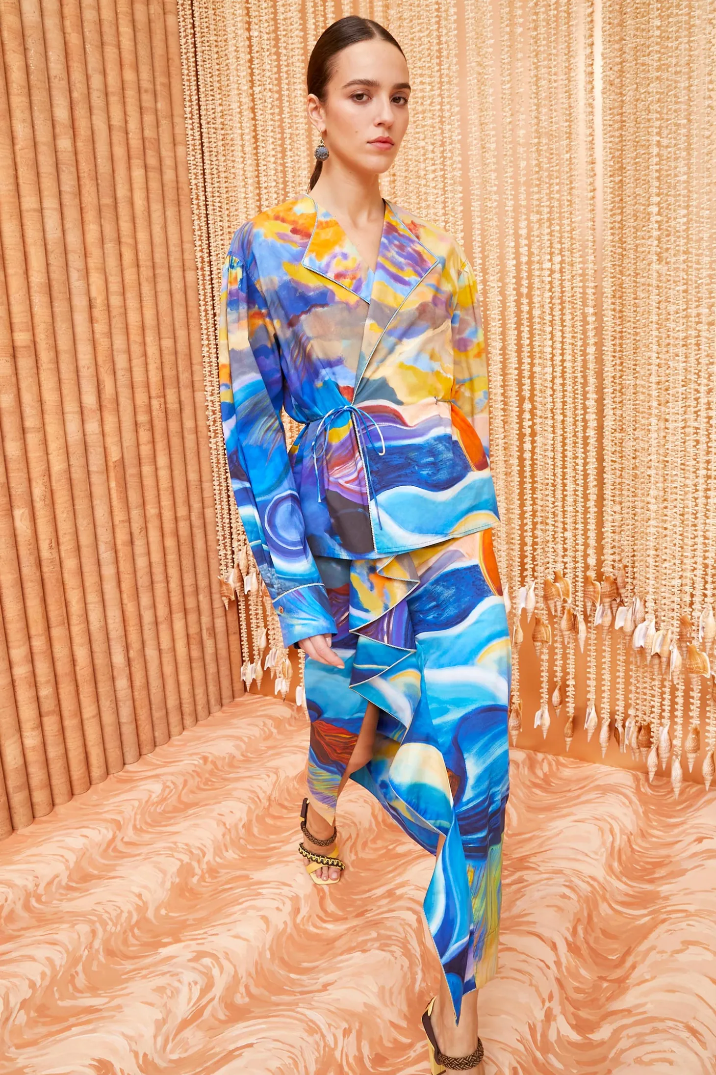 Featured in Look 4 of our Spring/Summer ‘24 Runway Show, the Holland Jacket is part of our exclusive collaboration with painter Shara Hughes, whose captivating 2021 sunset painting “Tuck” is translated across our signature cotton poplin in hypnotic blue and yellow hues. A limited-edition heirloom, this self-tie wrap silhouette is made from cotton poplin with voluminous sleeves and piped trims that delicately trace the wide lapels.