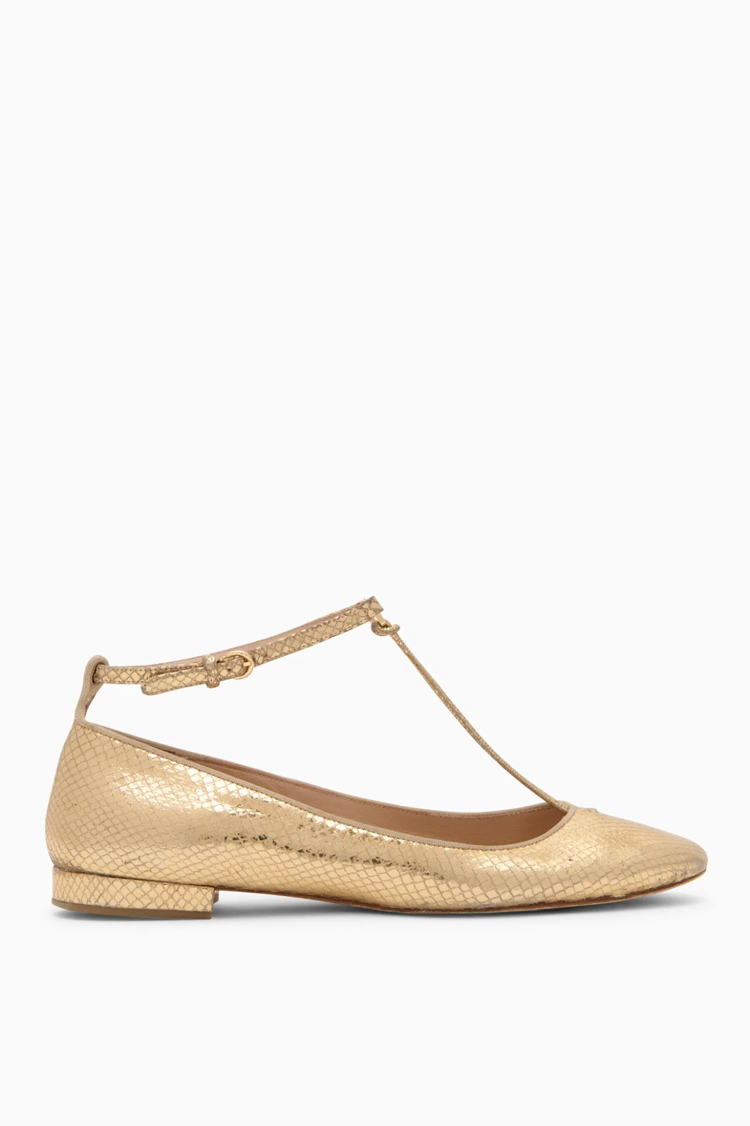 A true standout beauty, our round-toe Louise Flat is made in Spain from luxurious leather embossed with an enticing python motif. The glistening gold hue adds a gilded pop to any ensemble, while our signature U-shaped hardware at the T-strap provides a luxurious finish.