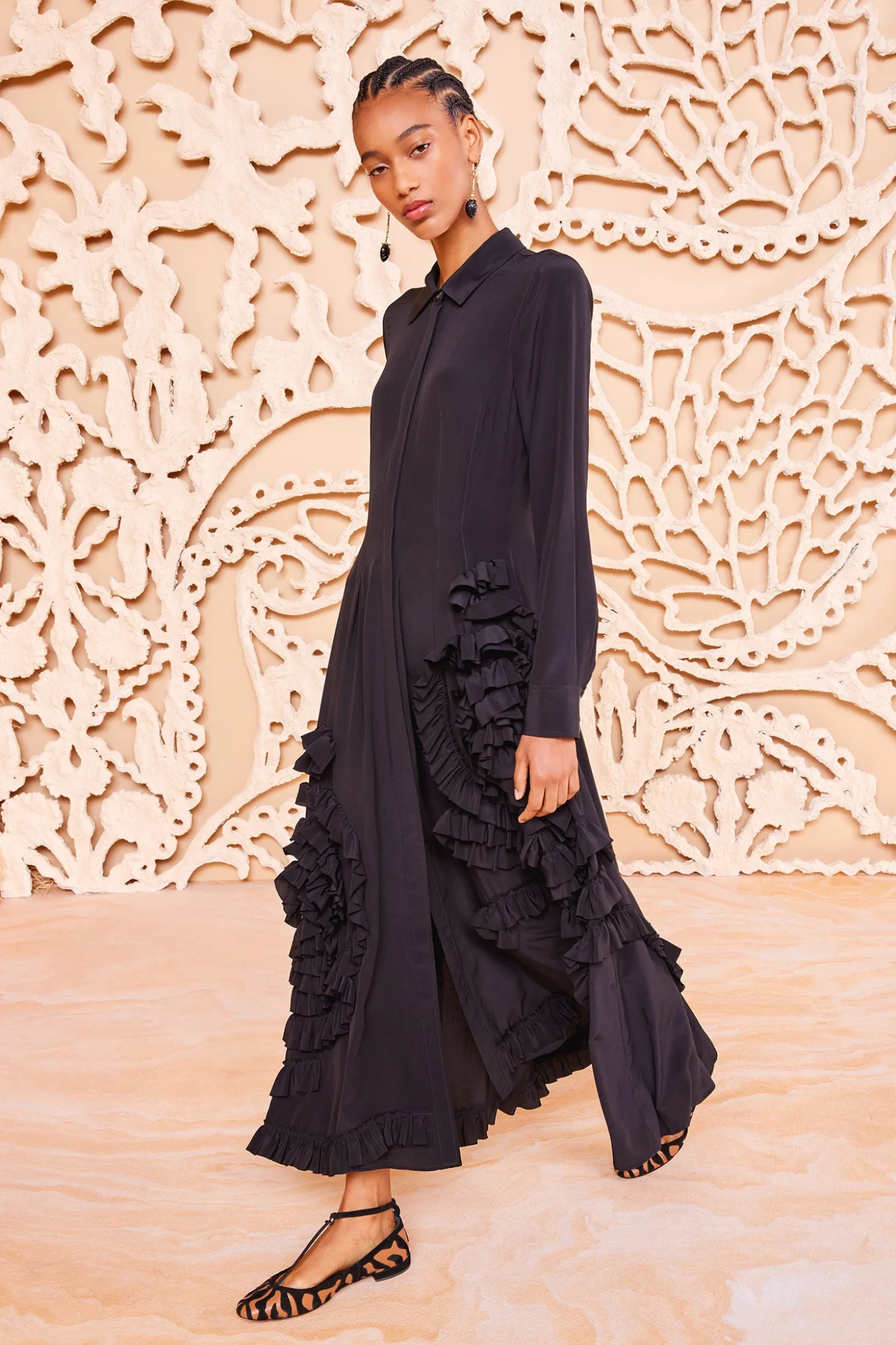 The Gwen Dress is a classic shirt silhouette crafted from black silk crepe de chine and adorned with frothy, spiral-shaped ruffles. Defining enduring elegance, this long-sleeve dress has a billowing maxi hemline and fastens with concealed front buttons.