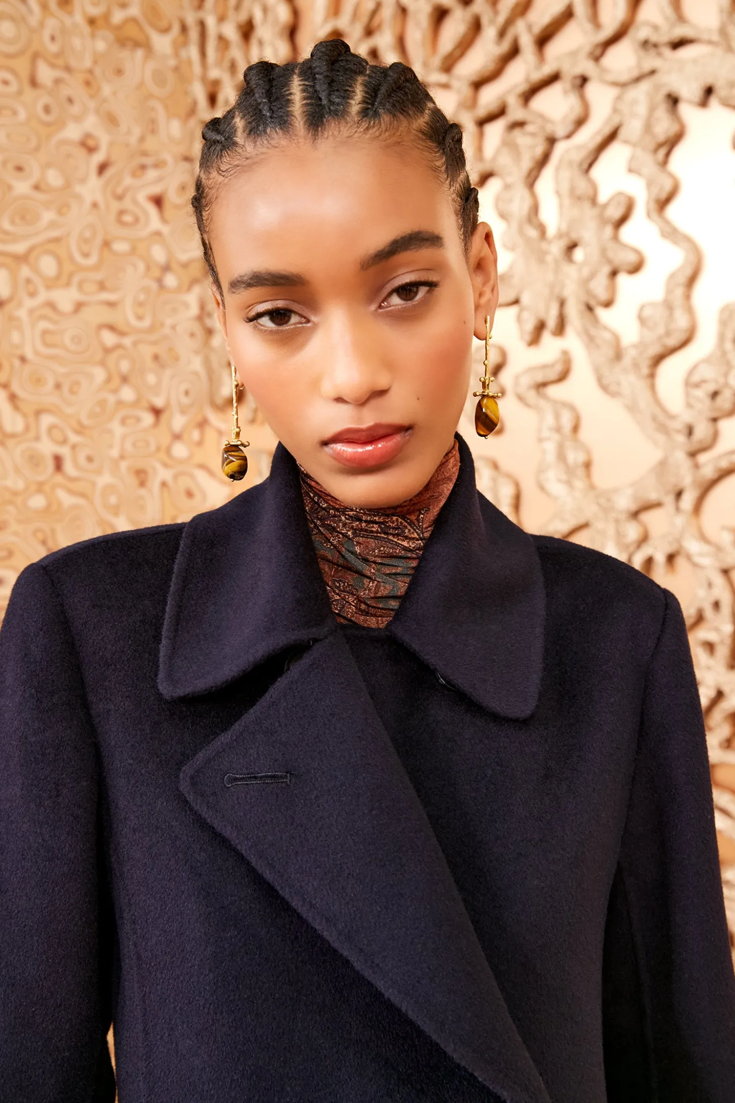 Our Lucie Coat is expertly tailored from double-faced wool blended with luxurious cashmere and arrives in timeless midnight blue. This peacoat features a short hem, wide notch lapels, and side flap pockets. It has a classic double-breasted fastening through the front.