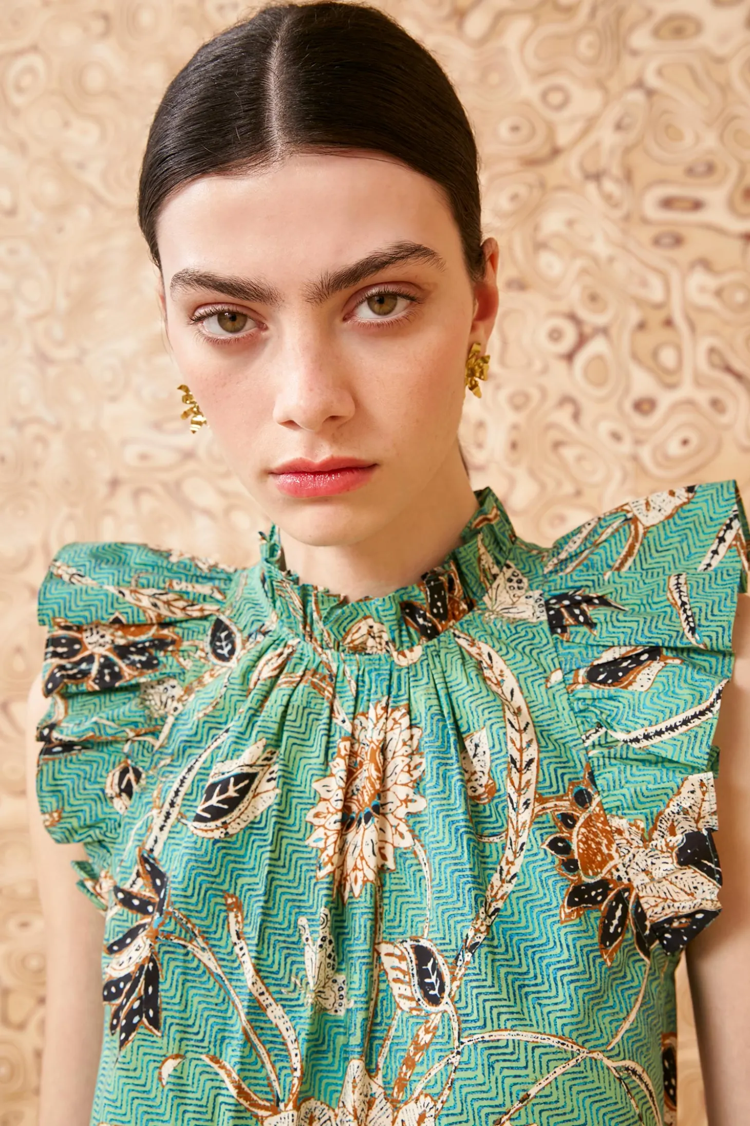 Our forever-favorite Tilda Top is crafted from our signature cotton poplin with trailing botanicals layered over a green backdrop with graphic diamonds. This sleeveless style features a high, ruffled neckline and fastens with a back buttoned closure. Pair yours with our Makana Skirt for coordinated elegance.