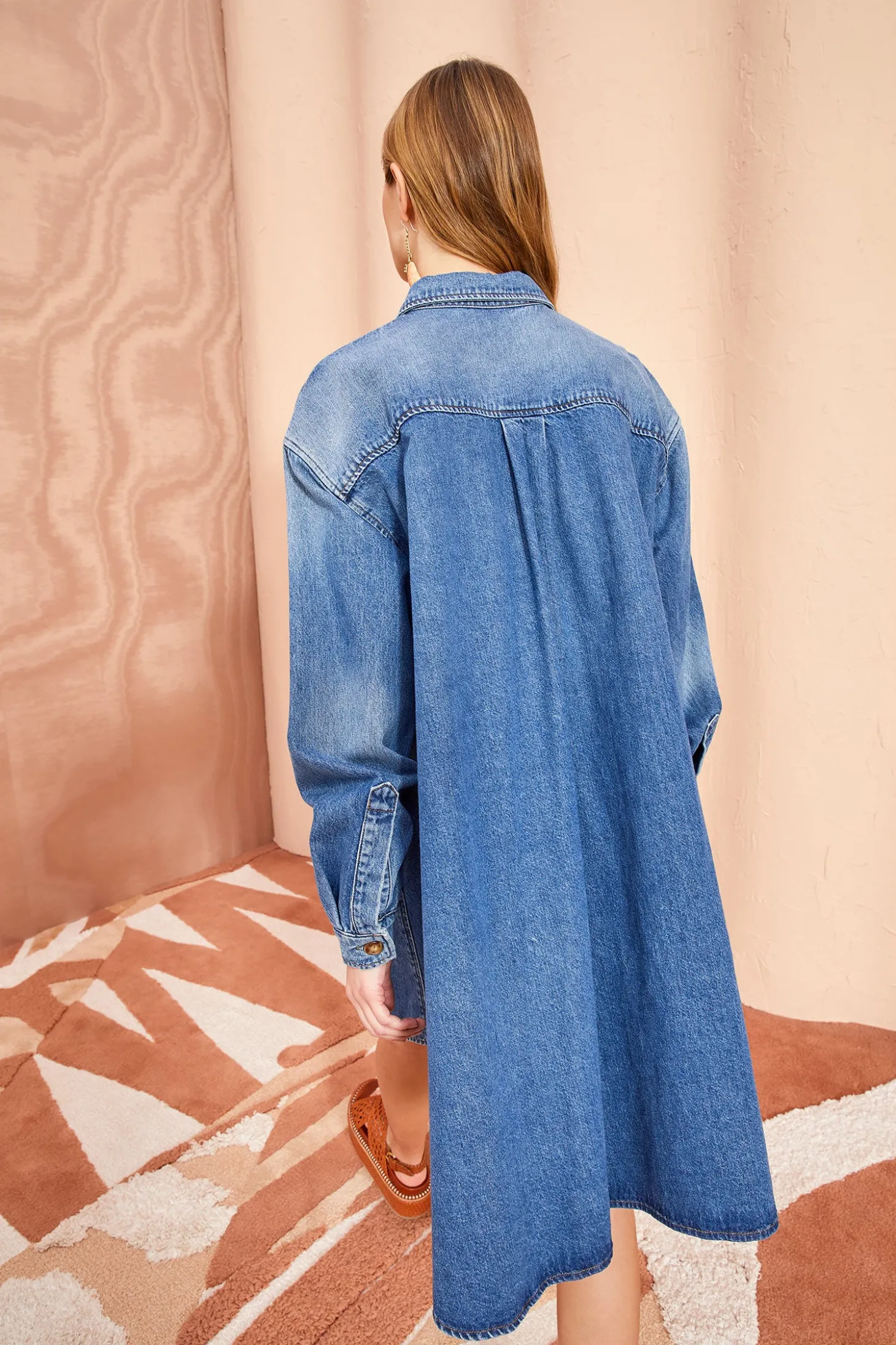 The Valerie is an oversized shirtdress crafted from our signature handmade denim in a perfect blue wash. This classic button-down shirt silhouette features oversized front pockets and loose sleeves that button at the cuff. Wear it as a mini dress or pair it with jeans in our Danube medium blue wash to achieve a full denim look.