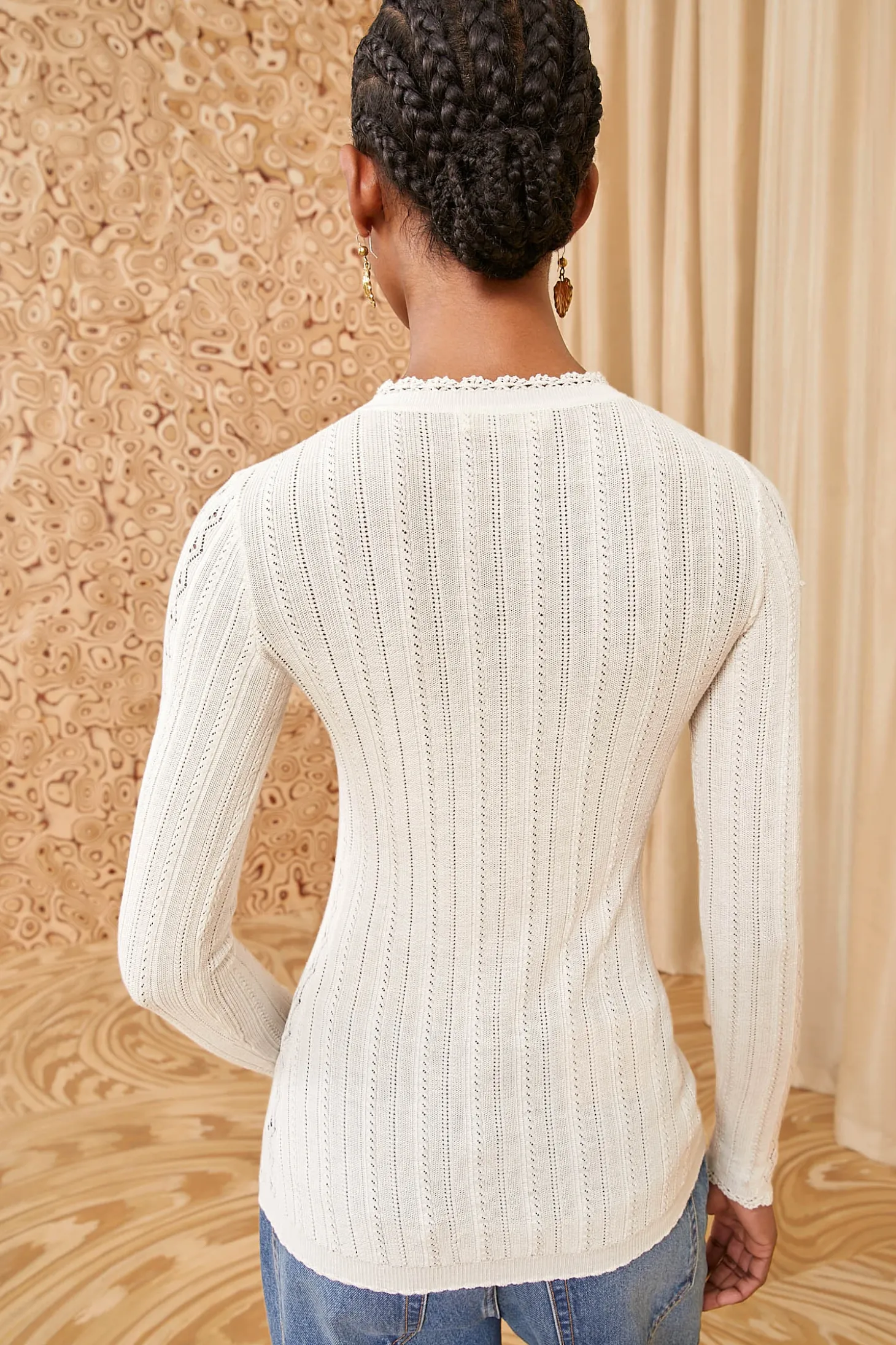 A layer-friendly beauty, our Delia Top is spun from the finest cotton and silk into a dynamic pointelle knit inspired by antique textiles. Imbued with a hint of stretch, this long-sleeve style has a classic crewneck, a close fit, and is a pearly white hue for optimal versatility. It fastens with a button front placket.