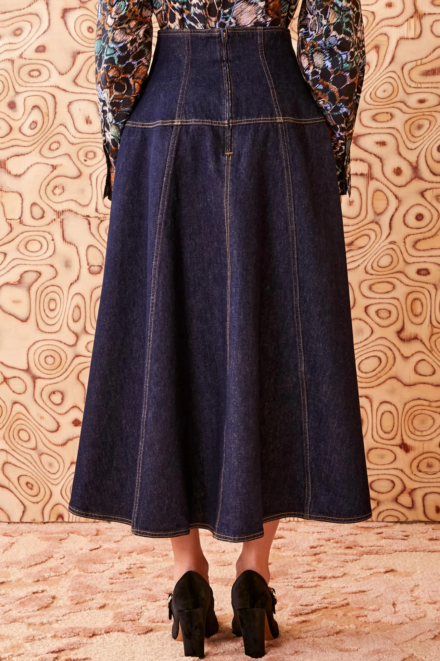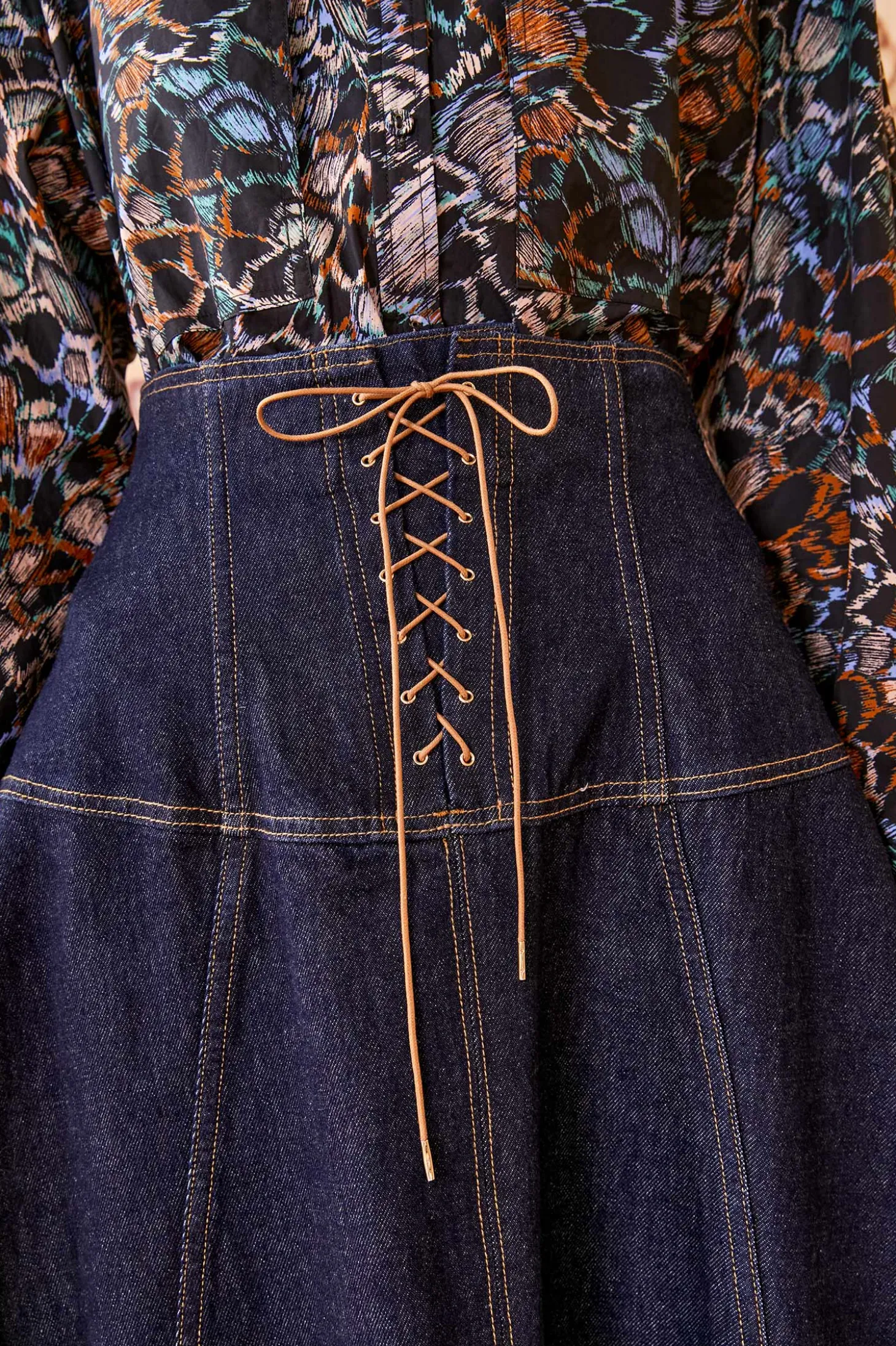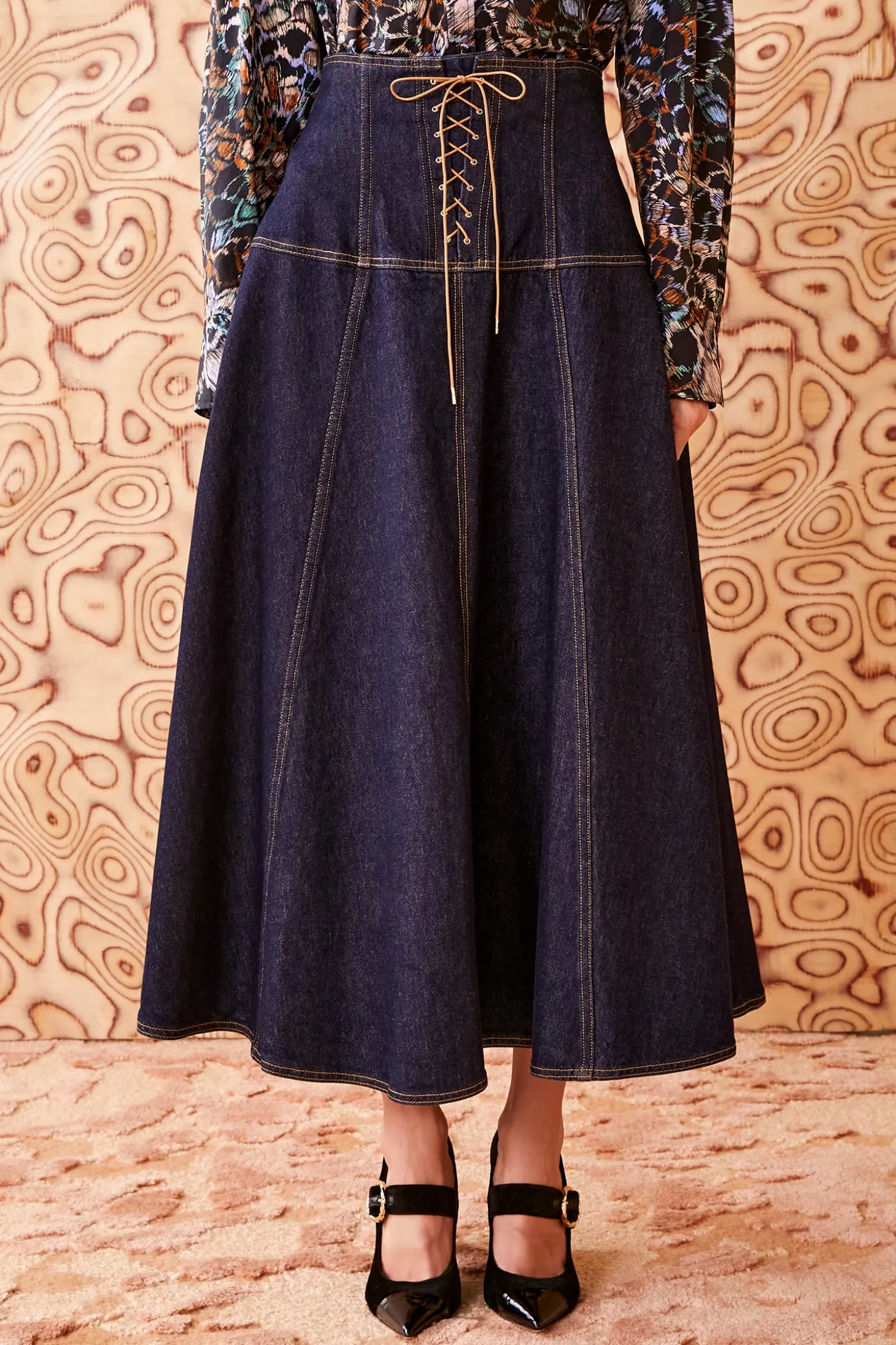 The Estelle Skirt is our new denim silhouette with an A-line cut adorned with feminine lace-up detailing in a nod to traditional corsetry techniques. Masterfully handcrafted in Los Angeles, this midi-length style is detailed with contrast stitching and arrives in our deep indigo Tigris wash that evokes classic vintage denim.