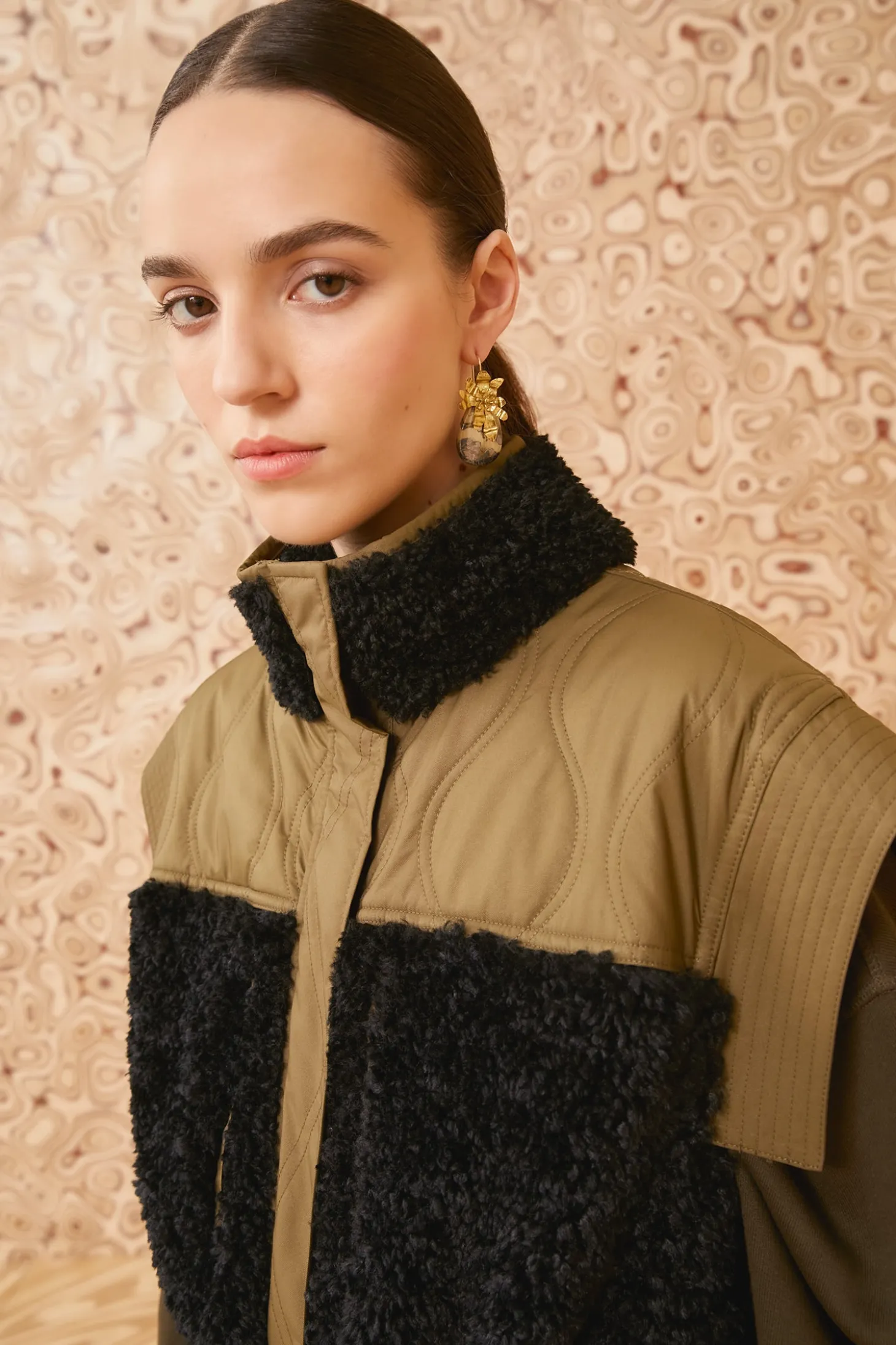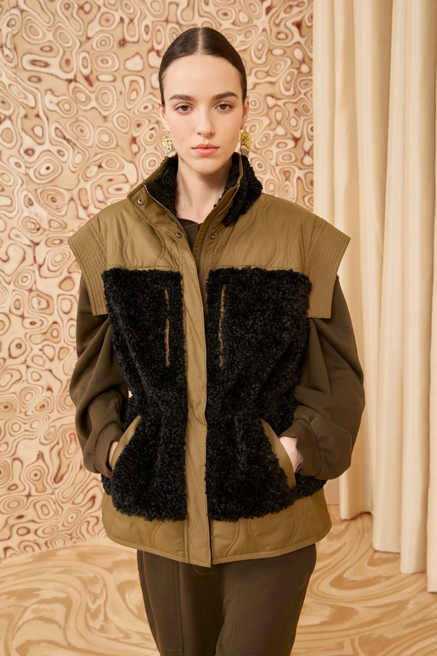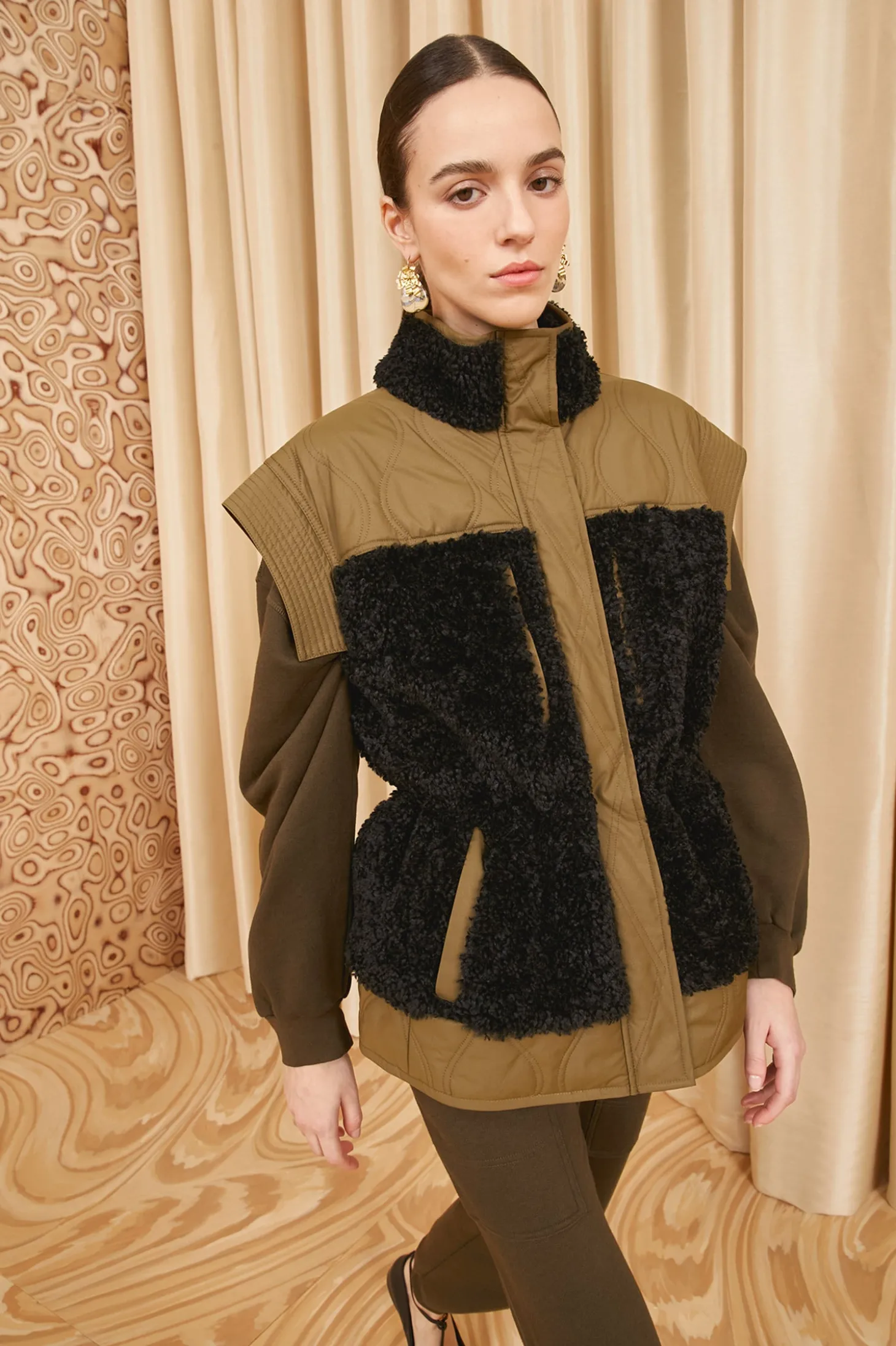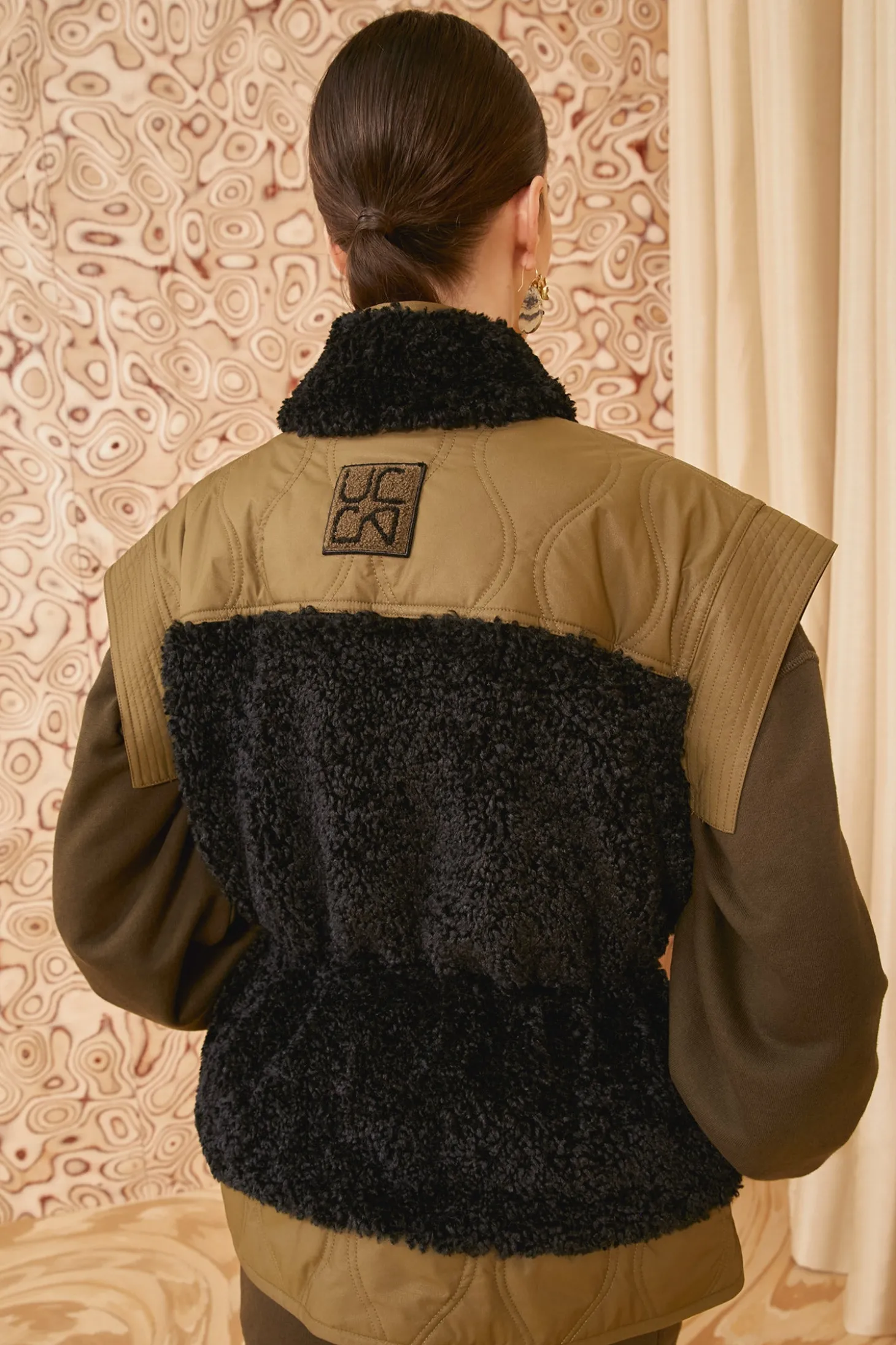 A versatile and sportif layer, our Shiloh Vest is crafted from plush dark green teddy fleece with panels of lightweight quilted sateen in a lighter shade. It’s designed with a cozy high neckline, has a generous amount of pockets, and slightly nips in at the elastic waist. Our signature monogram adorns the back and it fastens with snaps and a zipper at the front.