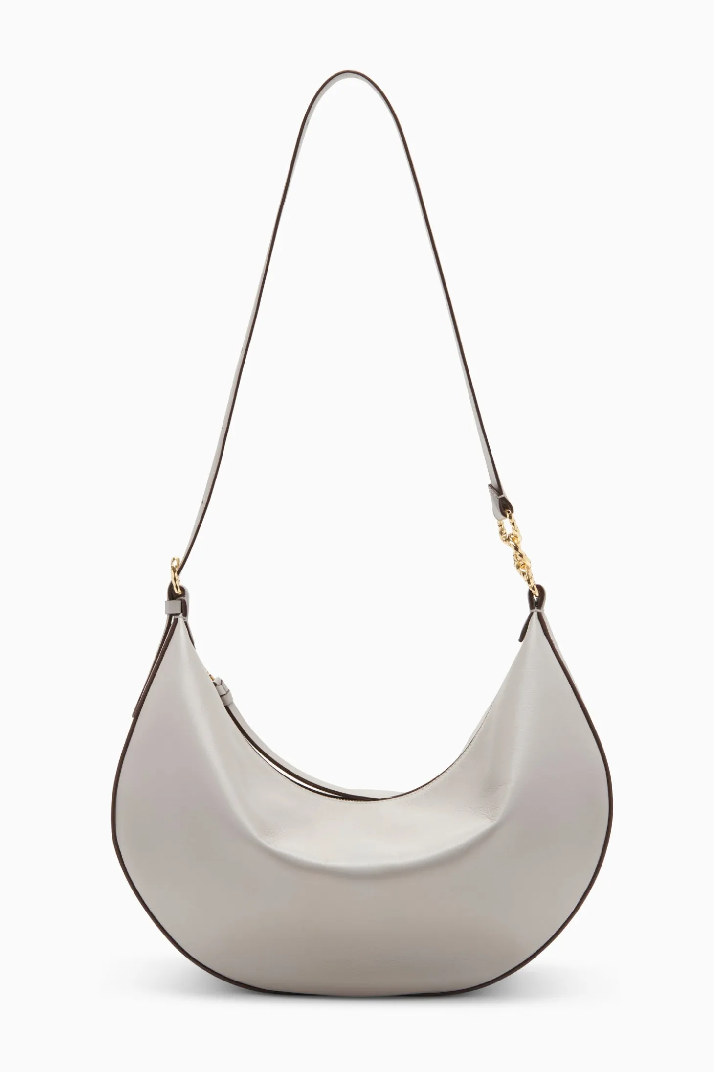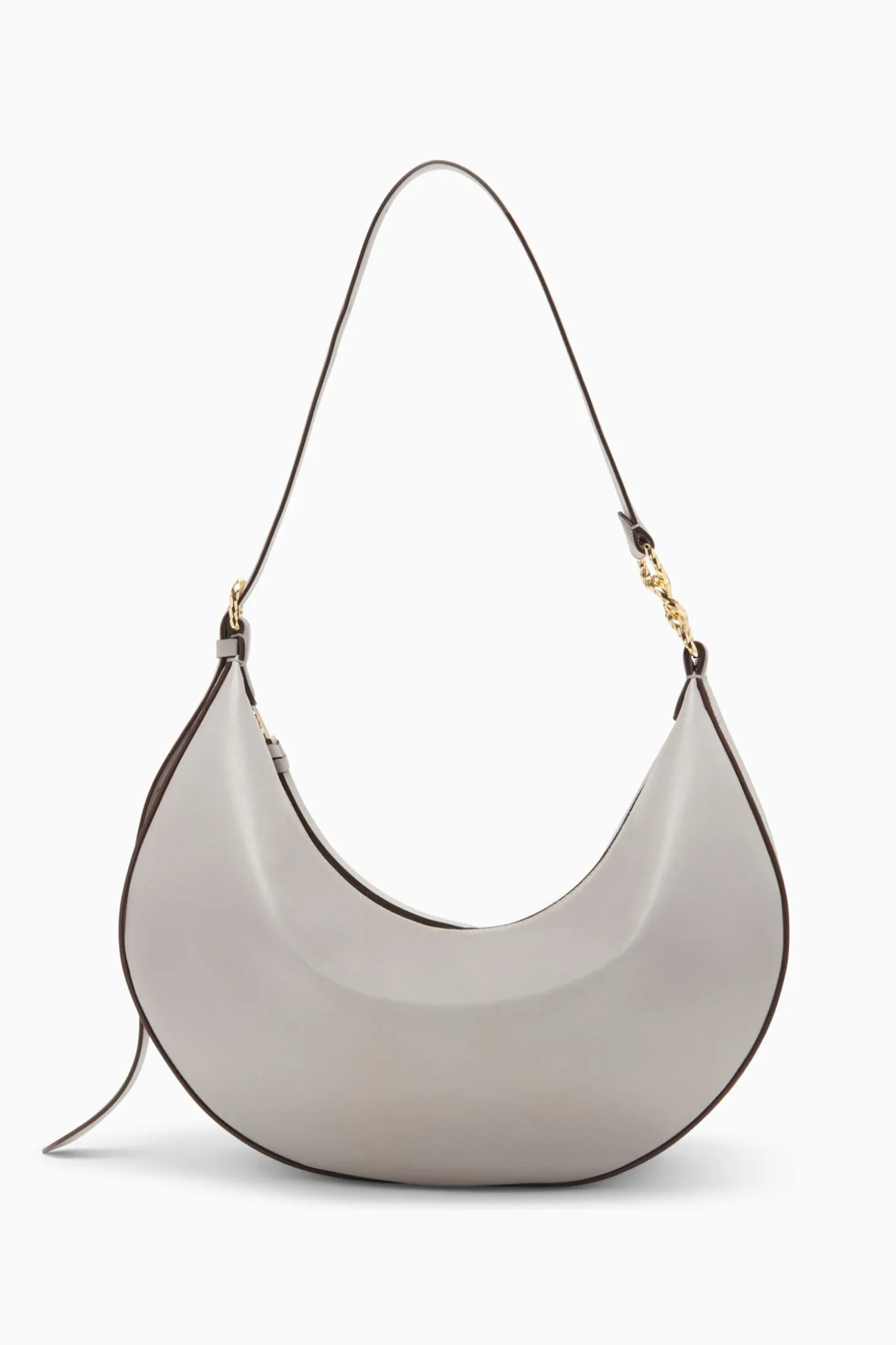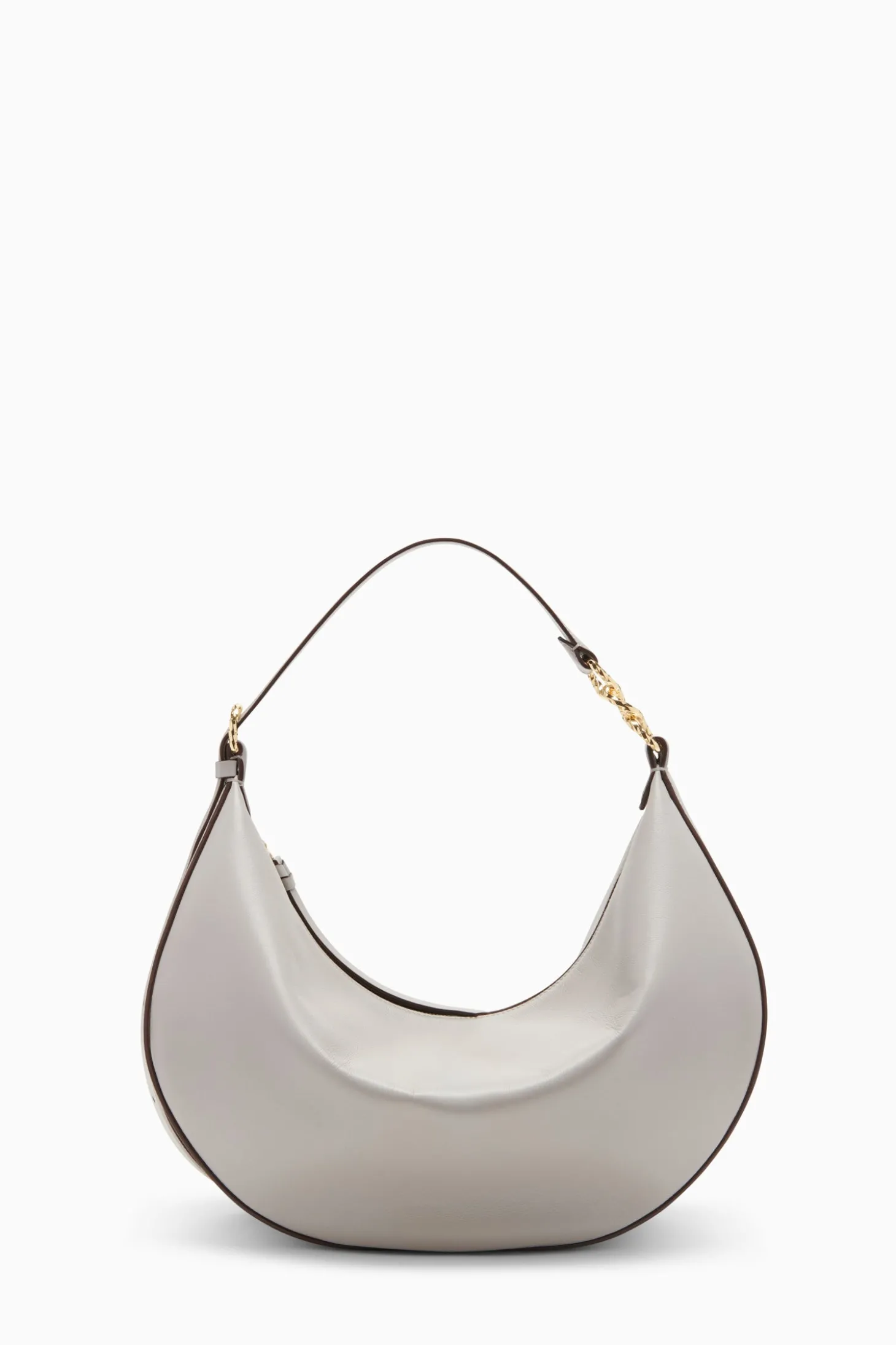 Our iconic Twyla silhouette makes its debut on our Autumn/Winter ‘24 runway. Expertly crafted in Italy from supple calfskin leather, this Dove gray beauty features a slouchy, moon shape that can be worn over the shoulder or as an elegant crossbody. It is finished with our new signature twisted buckle in lustrous antique brass.