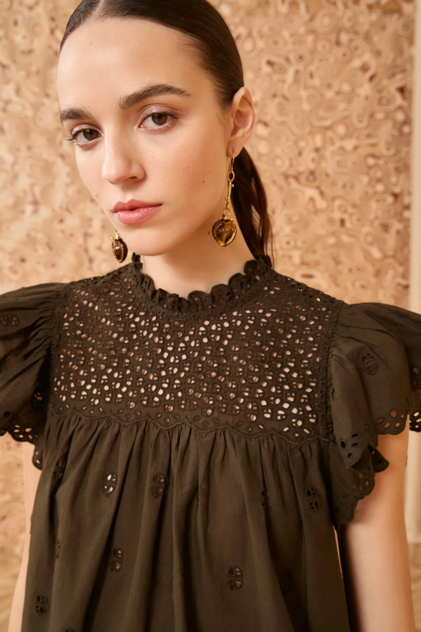 Our bestselling Kassi Top arrives in lightweight cotton voile beautifully embellished with our new geometric eyelets. Arriving in a rich and earthen green, this effortless style features frothy ruffles at the neck and sleeves, has an elegantly loose fit, and easily pairs with our handcrafted denim. It fastens with a back buttoned keyhole.