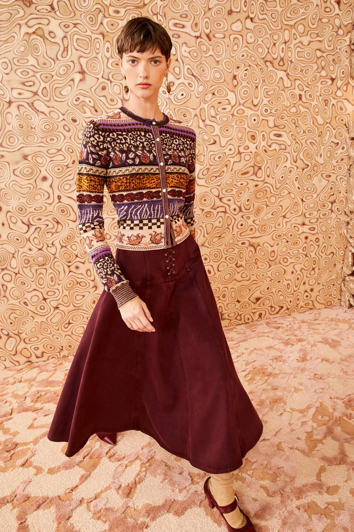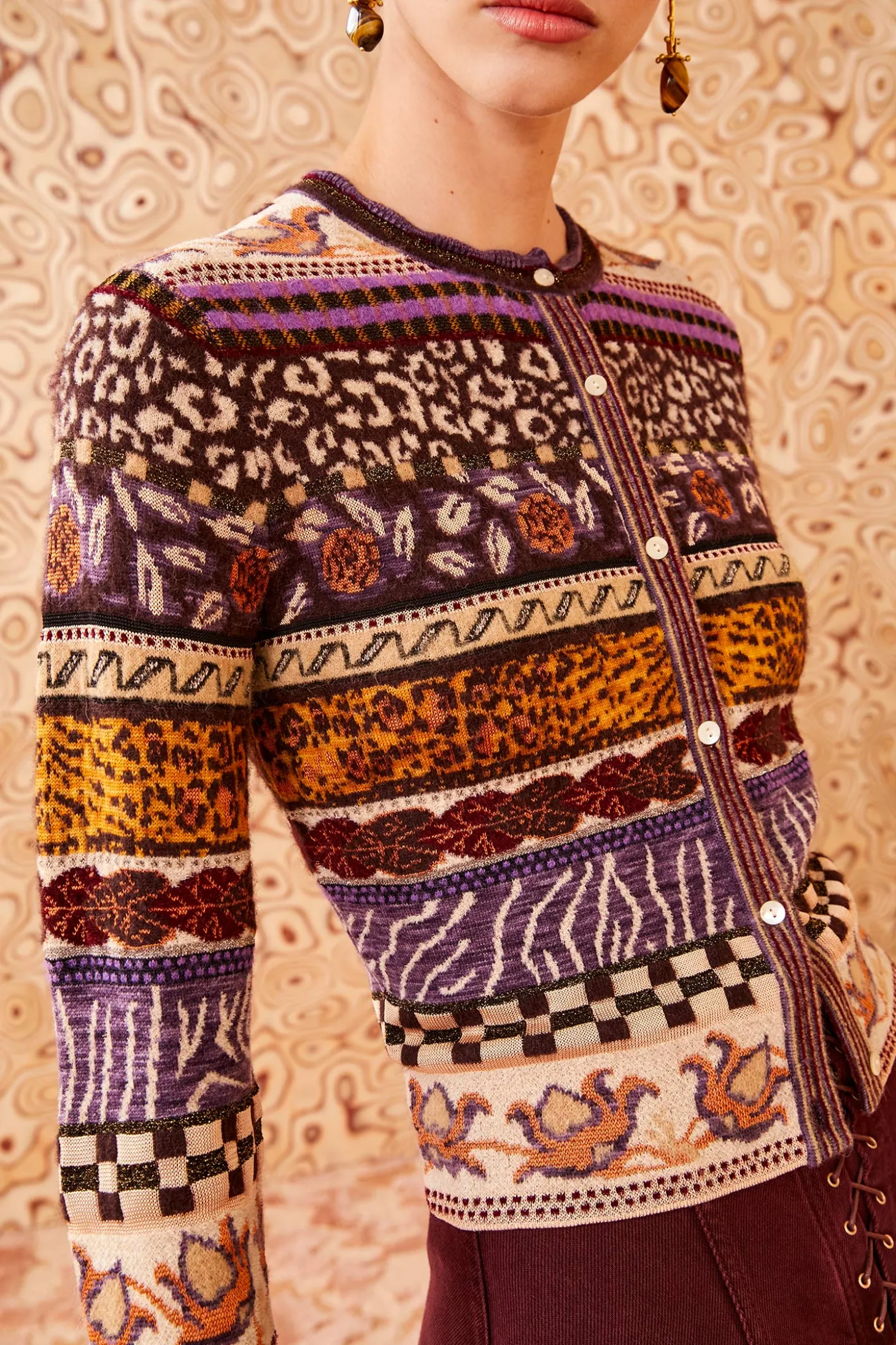 An eye-catching essential, our Liza Cardigan is spun from mid-weight jacquard with a stunning display of Fair Isle motifs in vibrant purple and gold hues. Made with hints of wool and alpaca, this long-sleeve, button-down fits close to the body and has metallic yarns that add a glimmering touch.